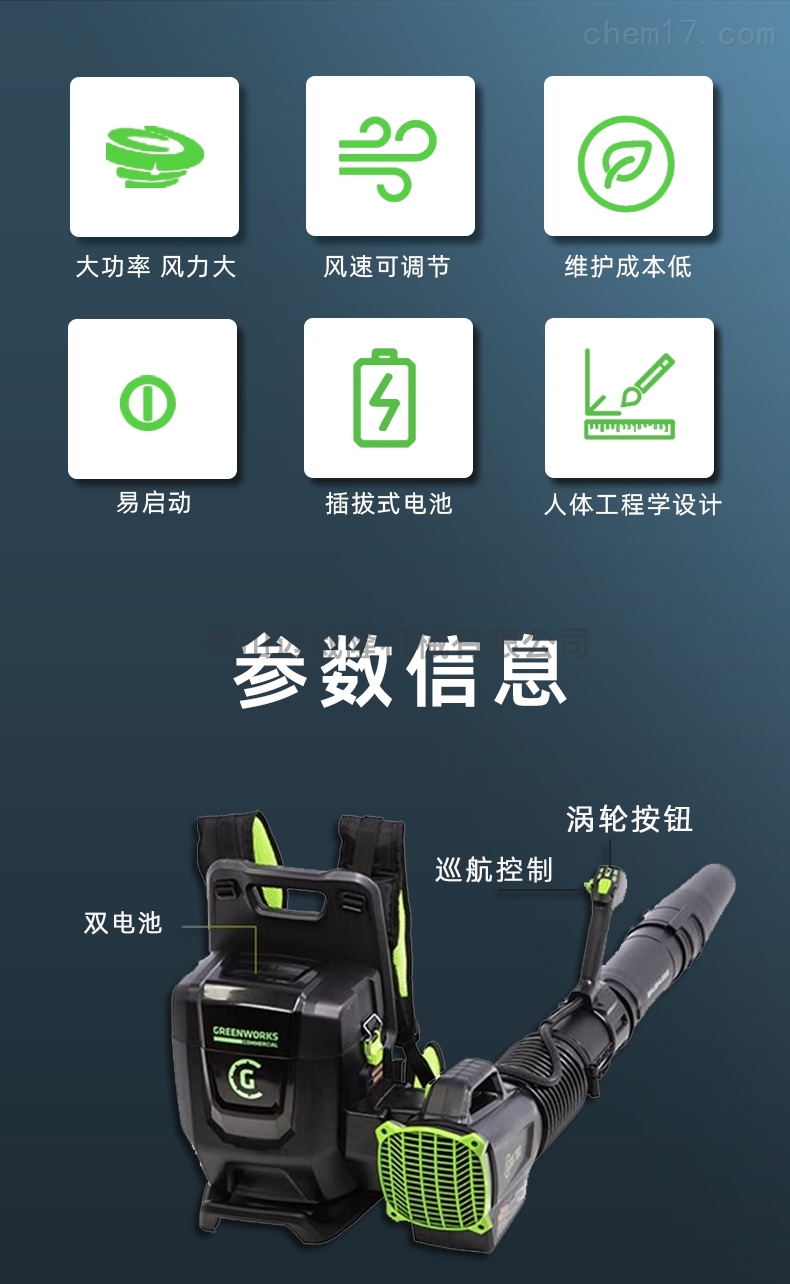 產(chǎn)品特點(diǎn):glebe 82v背包式吹風(fēng)機(jī),雙電池倉(cāng),一鍵啟動(dòng),無刷電機(jī)。它具有低噪音、雙電池室、長(zhǎng)壽命、低能耗、渦輪增壓、靈活性和便攜性的特點(diǎn)。一年保修,靈活輕便,可調(diào)節(jié)風(fēng)速,續(xù)航時(shí)間長(zhǎng),雙電池,高功率。適用于建筑工地吹渣、溫室吹雪、風(fēng)力滅火、道路清潔、衛(wèi)生清潔等。82v雙鋰電池吹風(fēng)機(jī),與雙電池同時(shí)安裝,使用時(shí)間更長(zhǎng),靈活輕便,具有巡航控制。使用地點(diǎn):在道路上吹礫石,在溫室里吹雪,在物業(yè)社區(qū)里吹落葉,森林滅火,風(fēng)力滅火。